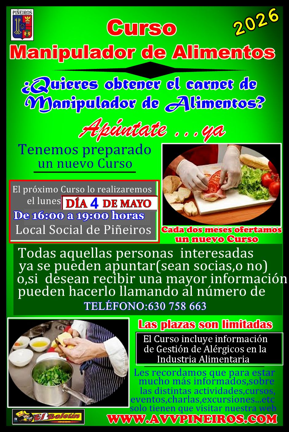 El día 4 de Mayo tendrá lugar una nueva edición del curso de manipulador de alimentos.